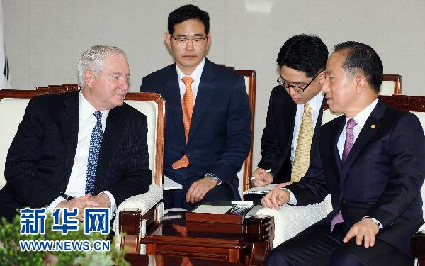 7月20日,在韓國首爾,韓國國防部長官金泰榮(前右)與美國國防部長羅伯特·蓋茨(前左)會談。韓國軍隊聯合參謀本部20日表示,韓國與美國決定于7月25日至28日在韓國東部海域(即日本海)舉行聯合軍事演習。韓國國防部長官金泰榮和來訪的美國國防部長羅伯特·蓋茨在當天的會談中商定了軍演的日期和規模。新華社/聯合通訊社