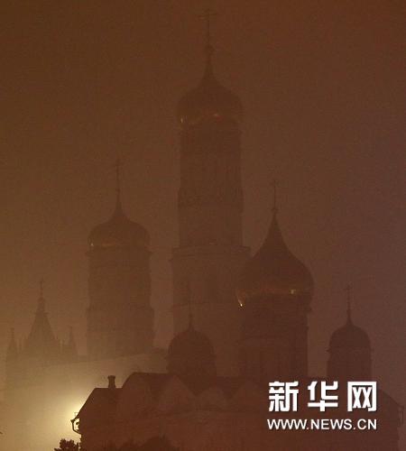 受周圍森林火災影響,莫斯科被煙霧籠罩。圖為8月4日拍攝的莫斯科克里姆林宮內的教堂。