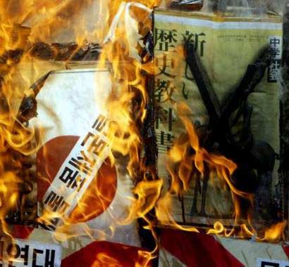 資料圖片:韓國抗議者在日本駐韓國大使館前燒毀日歪曲歷史教科書。