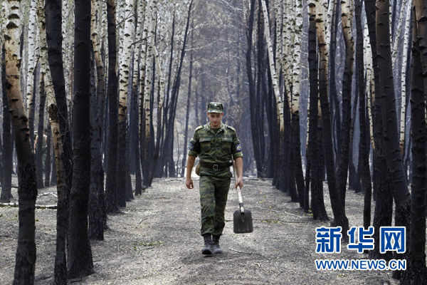 7月30日,在俄羅斯沃羅涅日市郊,一名士兵走過被大火燒毀的白樺樹。俄羅斯各地持續的高溫干旱天氣導致森林火災頻發。新華社/路透