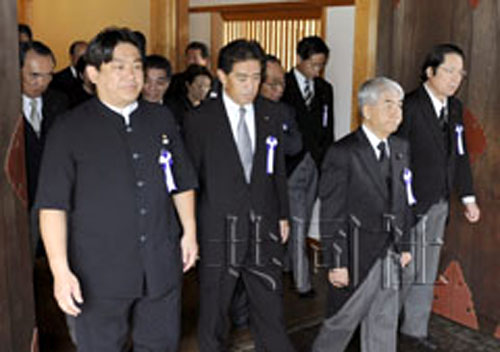 據(jù)介紹,包括該議員會(huì)的成員在內(nèi),共有40余名國會(huì)議員在上午進(jìn)行了參拜,另有約50名國會(huì)議員派代表參拜。民主黨參議員羽田雄一郎、日本遺族會(huì)會(huì)長古賀誠(自民黨前干事長)、“奮起日本”黨代表平沼赳夫等集體參拜。此外,自民黨總裁谷垣禎一及前首相安倍晉三也分別進(jìn)行了參拜。