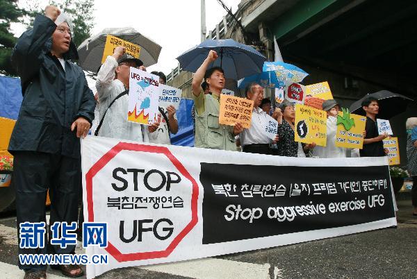 8月16日,韓國民眾在“韓美戰爭指揮中心”前舉行集會,呼吁和平,反對韓美舉行名為“乙支自由衛士”的聯合軍事演習。 新華社發(樸真熙攝)