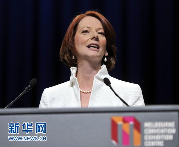 8月21日,在墨爾本會展中心舉辦的工黨“選舉之夜”上,澳大利亞現任總理朱莉婭·吉拉德向支持者發表演講。澳大利亞2010年聯邦選舉21日晚計票工作持續5個多小時后,仍沒有一個政黨在議會中贏得半數以上議席,選情膠著,勝負難分。計票工作從當地時間21日18時開始。在約76%的選票被統計后,現任總理朱莉婭·吉拉德領導的工黨獲得70個席位,而自由黨黨首托尼·阿博特領導的反對黨聯盟獲得72個席位。另外,綠黨獲得1個席位,獨立議員得到4個席位。計票工作目前仍在進行中。新華社記者黃曉勇攝