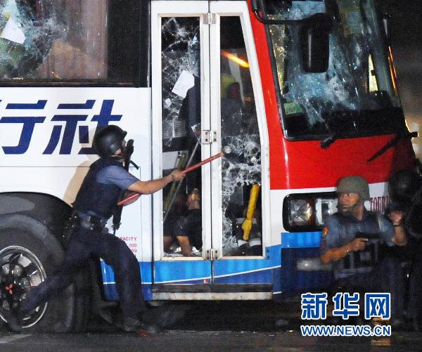 8月23日,在菲律賓馬尼拉,警察對(duì)被劫持旅游車展開行動(dòng)。新華社/法新