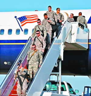 28日,又一批美國士兵乘坐軍機從伊拉克戰(zhàn)場上歸來。