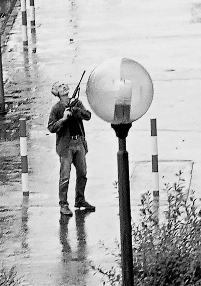 槍手戴著耳筒,在街上槍指周?chē)鷺怯睢?/FONT>