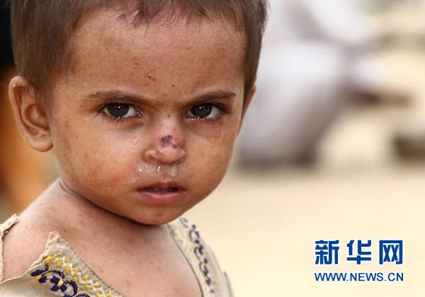 8月31日,在巴基斯坦南部的特達(dá)地區(qū),一名兒童等待就醫(yī)。罕見的洪災(zāi)給當(dāng)?shù)卦斐蓸O大破壞,在缺醫(yī)少藥的農(nóng)村地區(qū),災(zāi)民們特別是婦女兒童的生命安全時刻受到疾病的威脅。 新華社記者袁滿攝