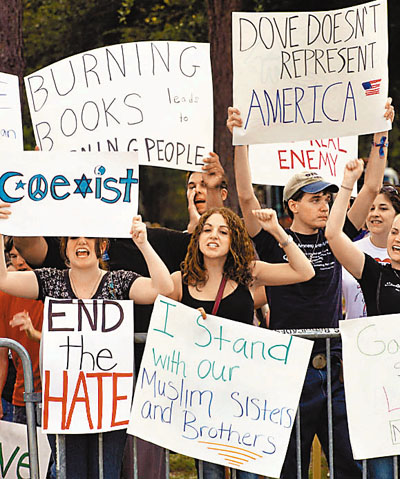 示威者在曾發起焚燒《古蘭經》的牧師瓊斯的教會外抗議“燒經”行為。