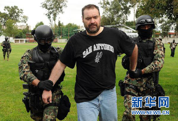 2010年9月13日,墨西哥一毒梟落網。 9月12日,在墨西哥普埃布拉市郊,墨西哥海軍陸戰隊士兵押送被捕的毒梟塞爾希奧·比利亞雷亞爾·巴拉甘。(新華社發,鮑菲菲攝)