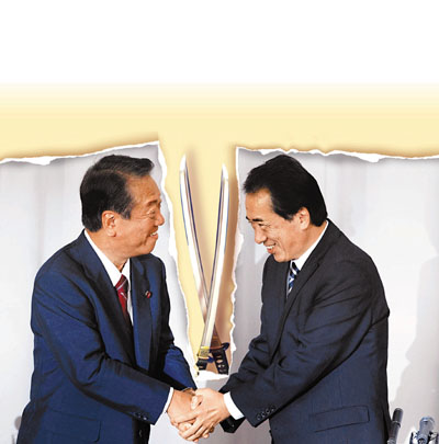 菅直人(右)與小澤一郎爭做黨魁火藥味濃。
