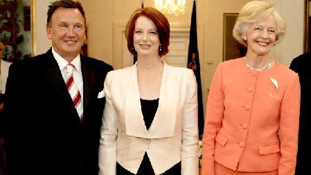 9月14日,吉拉德(中)宣誓就任澳總理后與男友馬西森(左一)以及澳總督布賴(lài)斯(右一)合影留念