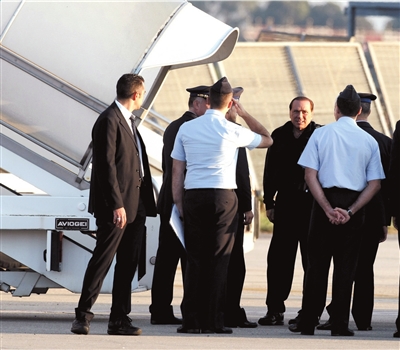 9月16日,意大利總理貝盧斯科尼在錢皮諾軍用機(jī)場登機(jī),空軍官員向他敬禮。 圖/人民圖片