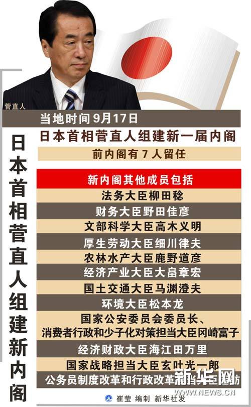 日本首相菅直人當天完成6月初上任以來首次內閣改組,任命前國土交通大臣前原為外相,接替岡田,留任防衛大臣北澤俊美。