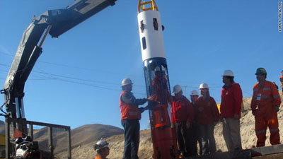 當救援通道完全打通后,工作人員將把這種救生艙放入井下,救生艙大概有一人大小,可以將井下礦工一個接一個的運送出洞。智利政府表示,如果進展順利,他們可能將于11月初或者更早被救出。