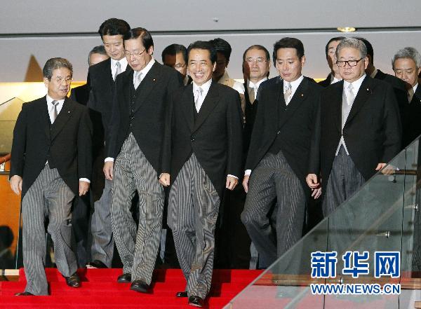 9月17日,在日本東京,日本首相菅直人(中)率新一屆內閣成員在官邸亮相。當日,日本首相菅直人組建新一屆內閣。 新華社/路透