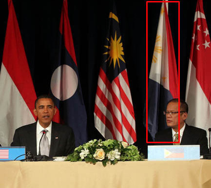 9月24日,美國(guó)總統(tǒng)奧巴馬在在紐約同東盟國(guó)家領(lǐng)導(dǎo)人舉行會(huì)晤。當(dāng)時(shí)懸掛于菲律賓總統(tǒng)阿基諾三世身后的菲律賓國(guó)旗紅色在上、藍(lán)色在下,系倒掛。