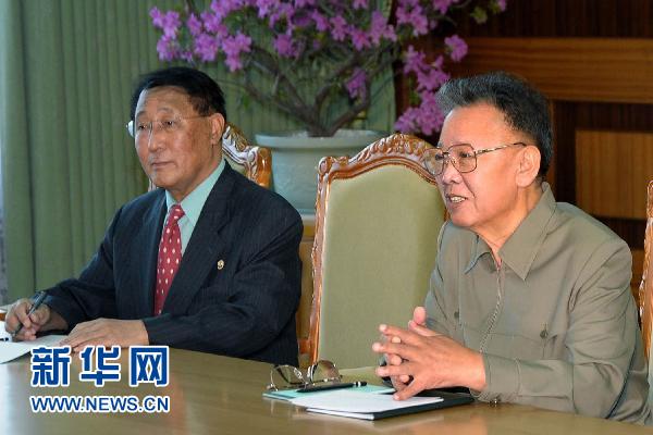資料圖片:這是朝鮮最高領(lǐng)導(dǎo)人金正日(右)與2010年9月23日被任命為朝鮮內(nèi)閣副總理的姜錫柱在朝鮮首都平壤出席會議的資料照片(2009年8月4日攝)。 新華社/法新