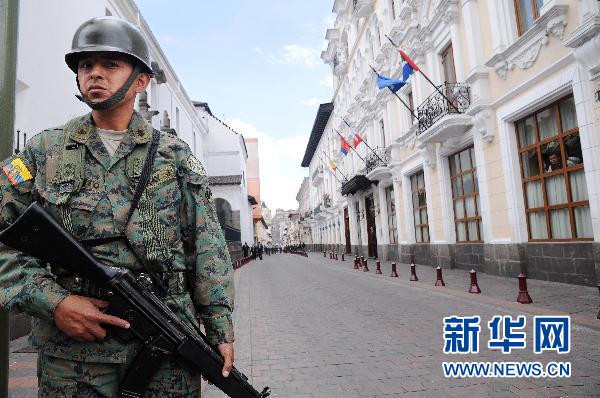 10月1日,在厄瓜多爾首都基多,士兵在總統府附近警戒。新華社發(圣地亞哥·阿馬斯攝)