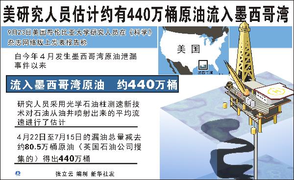 2010年9月24日 圖表:美研究人員估計約有440萬桶原油流入墨西哥灣 新華社發