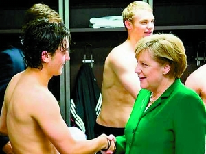 從照片中可以看出,更衣室里一片狼藉。不少球員赤裸上身,默克爾則穿著綠色外套,站在半裸的球員們面前與他們親切交談。德國中場厄齊爾事后說,那時(shí)大家雖然為贏球感到高興,但默克爾的到來確實(shí)令氣氛有點(diǎn)尷尬,衣衫不整的情況下與總理握手真令人感到不自在。