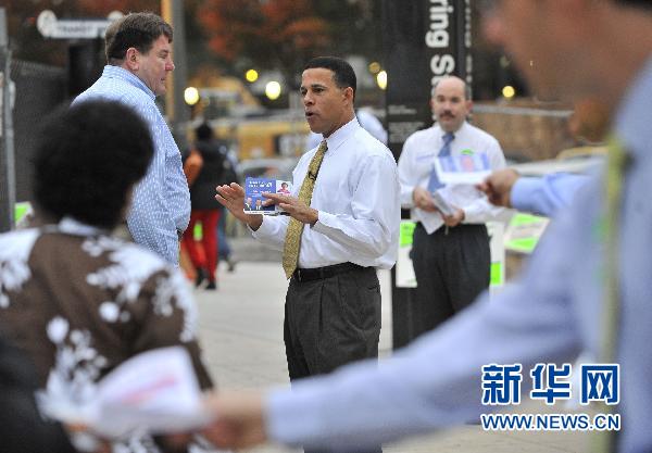 10月26日,在美國首都華盛頓以北10公里的馬里蘭州銀泉,馬里蘭州副州長安東尼·布朗(中)在街頭散發(fā)競選傳單,與選民交談。美國中期選舉將于11月2日舉行,民主黨和共和黨將爭奪國會眾議院全部435個議席和參議院100個議席中的37個。此外,38個州長及兩個美國海外屬地行政長官也將同時改選。新華社記者 張軍 攝