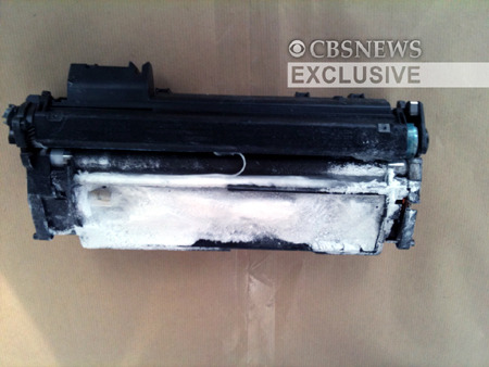 調查人員29日在英國東米德蘭茲(上)和迪拜分別截獲被改造的打印機,硒鼓里裝了電路板、電線和白色粉末。