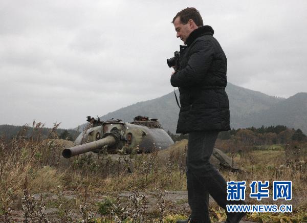 11月1日,俄羅斯總統梅德韋杰夫在南千島群島(日本稱北方四島)的國后島視察。新華社/俄新社