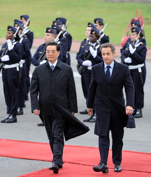 2010年11月4日 胡錦濤抵達(dá)巴黎開始對(duì)法國(guó)進(jìn)行國(guó)事訪問(wèn) 11月4日,國(guó)家主席胡錦濤在巴黎奧利機(jī)場(chǎng)出席法國(guó)總統(tǒng)薩科齊舉行的隆重歡迎儀式。這是胡錦濤主席在薩科齊總統(tǒng)陪同下檢閱儀仗隊(duì)。新華社記者劉建生攝