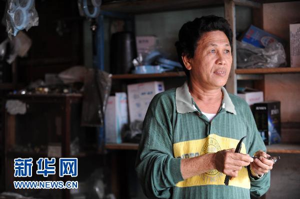 11月4日,在印尼北巴蓋島的希卡卡普村,華人李沖天在商店內講述自己的故事。印度尼西亞明打威群島海嘯已經(jīng)造成至少450人死亡,其中至少3人是印尼華人。 新華社記者金良快攝