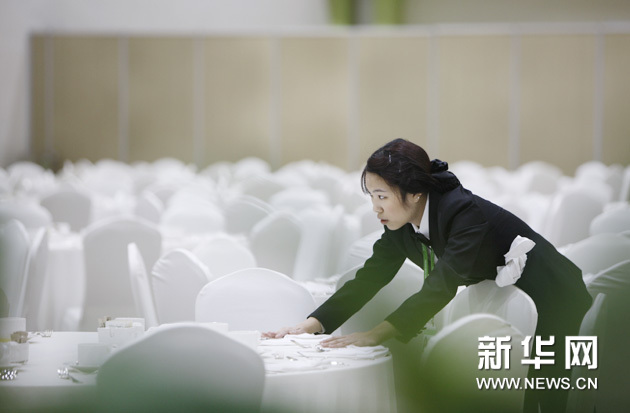 11月9日,服務(wù)員在韓國首爾G20峰會(huì)新聞中心內(nèi)整理餐桌。韓國首爾G20峰會(huì)即將于11月11日開幕,會(huì)場內(nèi)各項(xiàng)準(zhǔn)備工作有條不紊進(jìn)行中。新華社記者段卓力攝