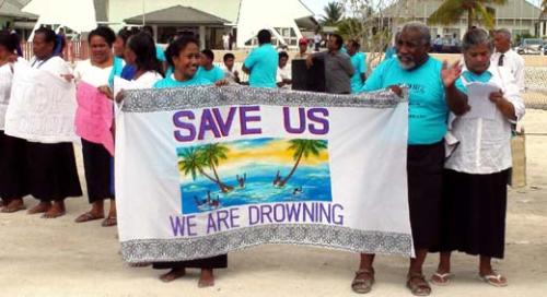 基里巴斯居民10日在國(guó)會(huì)外手持旗幟喊“救命”