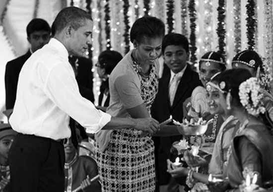 在訪印期間,奧巴馬夫婦與印度學(xué)生一起慶祝當(dāng)?shù)氐呐艧艄?jié)