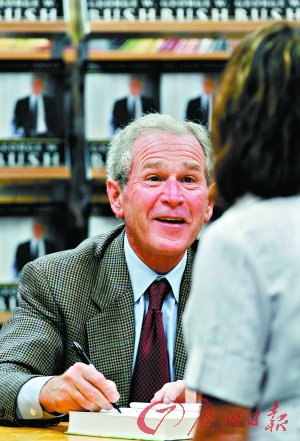 布什9日在達拉斯居所附近的一家書店里簽名售書。
