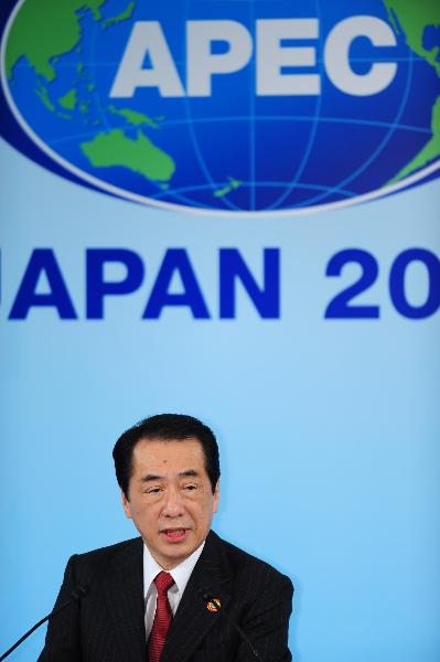 11月14日,在日本橫濱,日本首相菅直人在記者會上回答記者提問。當日,亞太經合組織(APEC)第十八次領導人非正式會議在日本橫濱閉幕。會后,日本首相菅直人召開記者會,回答記者提問。 新華社記者季春鵬 攝