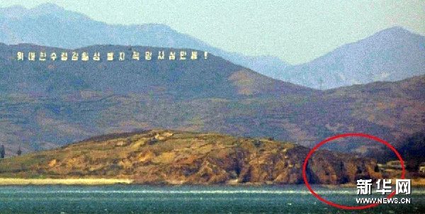 這是從韓國延坪島上拍攝的朝鮮一方海岸,標(biāo)記部分為炮洞穴。新華社/聯(lián)合通訊社