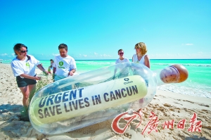 慈善組織在坎昆海灘放出一個巨大的漂流瓶,上面寫著“十萬火急,在坎昆挽救生命”。