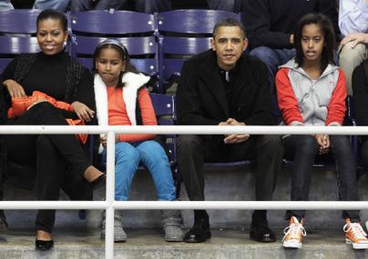 11月27日,奧巴馬(右二)和家人一起觀看籃球比賽