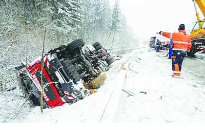 上圖為德國一段公路上因大雪發(fā)生了交通事故,出事車輛側(cè)翻在路邊。