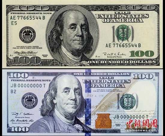 資料圖:新版(下)和舊版百元美鈔。圖片來源:中國新聞網(wǎng)
