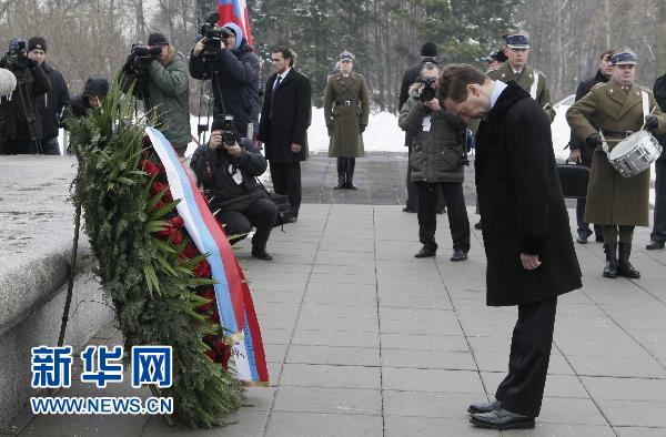 12月7日,俄羅斯總統(tǒng)梅德韋杰夫在波蘭首都華沙向蘇軍戰(zhàn)士墓紀念碑敬獻花圈。新華社/美聯(lián)社