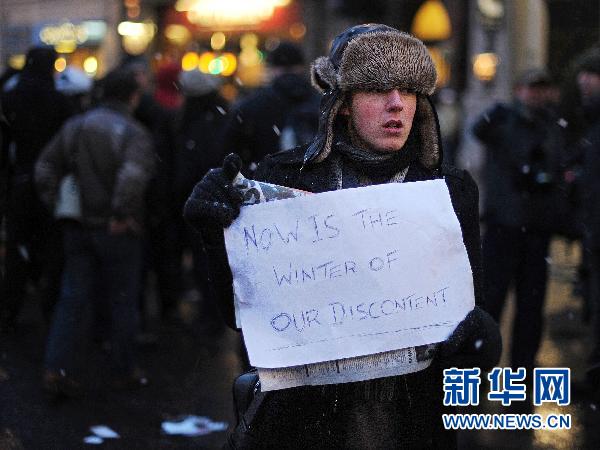 從上午開始,數(shù)千名學(xué)生就已經(jīng)出現(xiàn)在威斯敏斯特宮外,他們集體舉著“停止削減開支”、“對漲學(xué)費說不”的標語,一些激進的學(xué)生則呼吁舉行“總罷工”,抗議政府將大學(xué)學(xué)費上限從每年3200英鎊提高到9000英鎊。