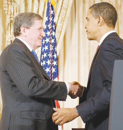 圖為霍爾布魯克(右)2009年1月22日在白宮與剛就任美國總統的奧巴馬握手。新華社/法新