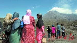 14日,印尼游客在參觀默拉皮火山噴發(fā)地。
