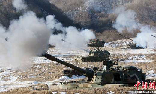 12月20日,韓國軍方開始在延坪島舉行海上實彈射擊訓練。資料圖為韓國K9火炮。