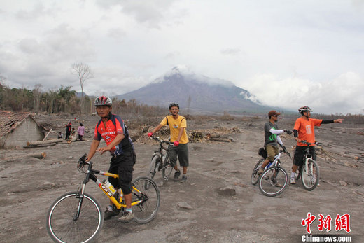 今年10月下旬,位于印尼日惹市的默拉皮火山在沉睡百年后,再次大規模數次噴發,并造成300多人罹難、成千上萬人受傷,數十萬人撤離家園。默拉皮火山11月份停止噴發后,來自印尼各地的民眾紛紛來此旅游觀光。火山腳下一個叫GUNGAND被火山巖漿埋沒的村莊,每天來旅游的人數逾5000人。圖為當地的自行車愛好者在默拉皮火山地區騎車游玩。中新社發 顧時宏 攝
