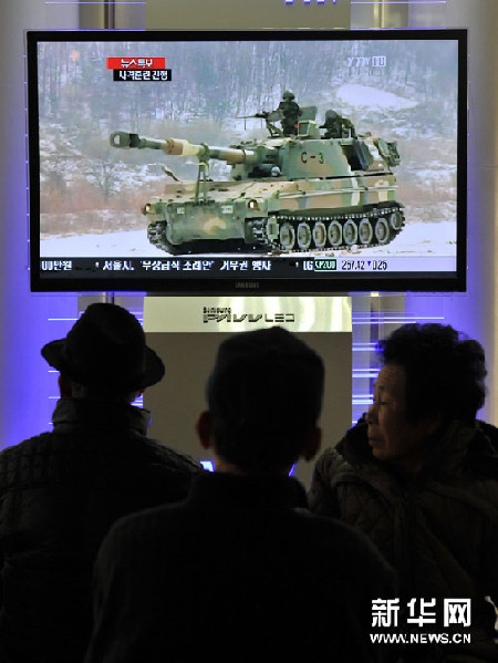 12月20日,民眾在韓國首都首爾火車站觀看有關實彈射擊訓練的新聞。韓國軍隊當地時間20日下午在延坪島舉行實彈射擊訓練。新華社/法新