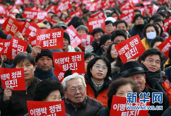 12月18日,在韓國首爾火車站,人們手舉標(biāo)語,高喊口號,要求李明博政府下臺。 新華社發(fā)(樸真熙攝)