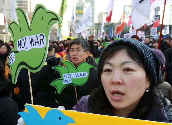 12月18日,在韓國首爾火車站,人們手舉標(biāo)語,高喊口號(hào),要求李明博政府下臺(tái)。當(dāng)日,數(shù)千名韓國民眾在首爾舉行抗議,要求李明博政府下臺(tái)。韓國政府16日宣布將在18日至21日之間的某一天在延坪島海域舉行海上實(shí)彈射擊訓(xùn)練。新華社發(fā)(樸真熙攝)