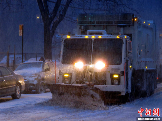 一場(chǎng)暴風(fēng)雪26日撲向美國(guó)東北部的新澤西州、紐約市等地,同時(shí)伴有時(shí)速達(dá)到四五十哩的勁風(fēng),預(yù)計(jì)26日及27日為這些地區(qū)帶來(lái)十英寸左右的積雪。公路行車危險(xiǎn)大增,卷起的漫天白雪可能造成航班嚴(yán)重誤點(diǎn),導(dǎo)致華盛頓、紐約和波士頓機(jī)場(chǎng)近日取消航班。圖為紐約法拉盛街頭掃雪車正在清理公路積雪。中新社記者 孫宇挺 攝