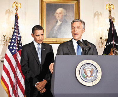 洪博培(右)于2009年獲奧巴馬提名出任駐華大使。